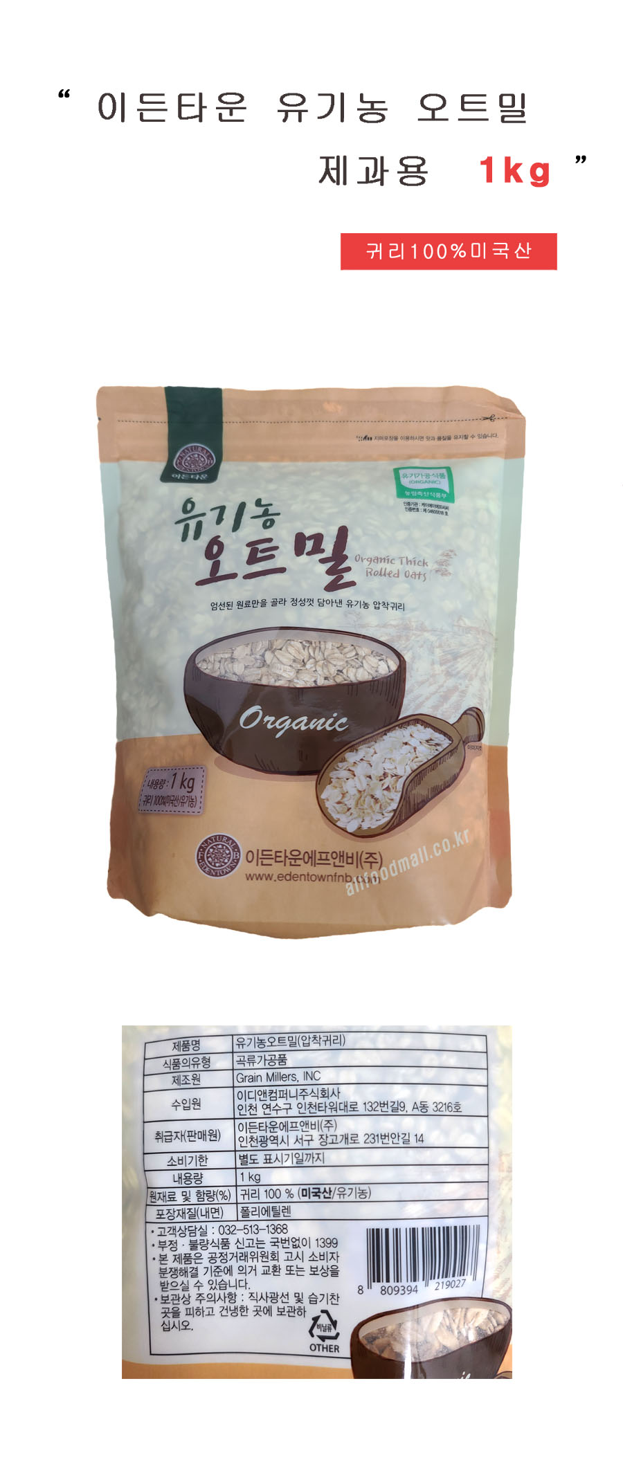 이든타운 유기농 오트밀 제과용 1kg 귀리